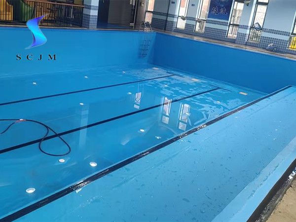 本項目位于四川成都市,為室內(nèi)游泳池,采用1.5mm藍(lán)色游泳池防水膠膜,滿刮膠搭邊熱熔焊接工藝,整體效果如下: